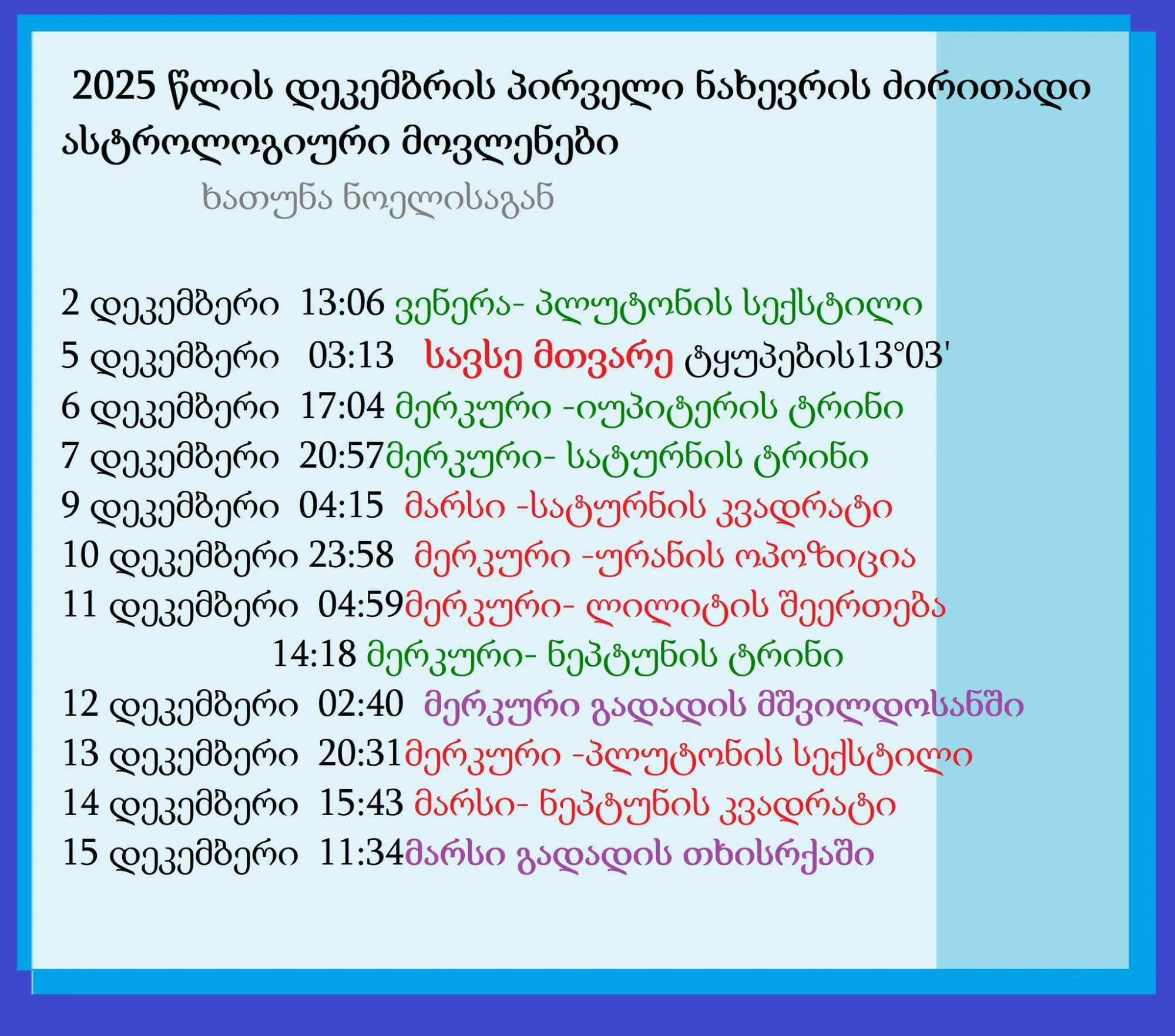 „2025 წლის დეკემბრის პირველი ნახევრის ძირითადი ასტროლოგიური მოვლენები ხათუნა ნოელისგან.