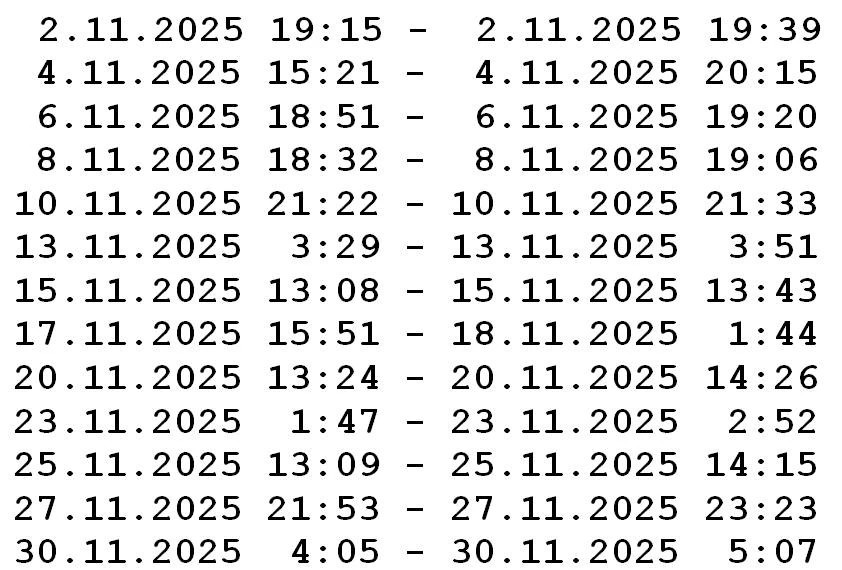 ქვემოთ მითითებული დროის ყველა მონაკვეთი გამოთვლილია თბილისის სასაათო სარტყლის მიხედვით (GMT +4). ბუნებრივია, სხვა სასაათო ზოლში მცხოვრებმა ადამიანებმა დროის შესაბამისი განსხვავება უნდა გაითვალისწინონ.
