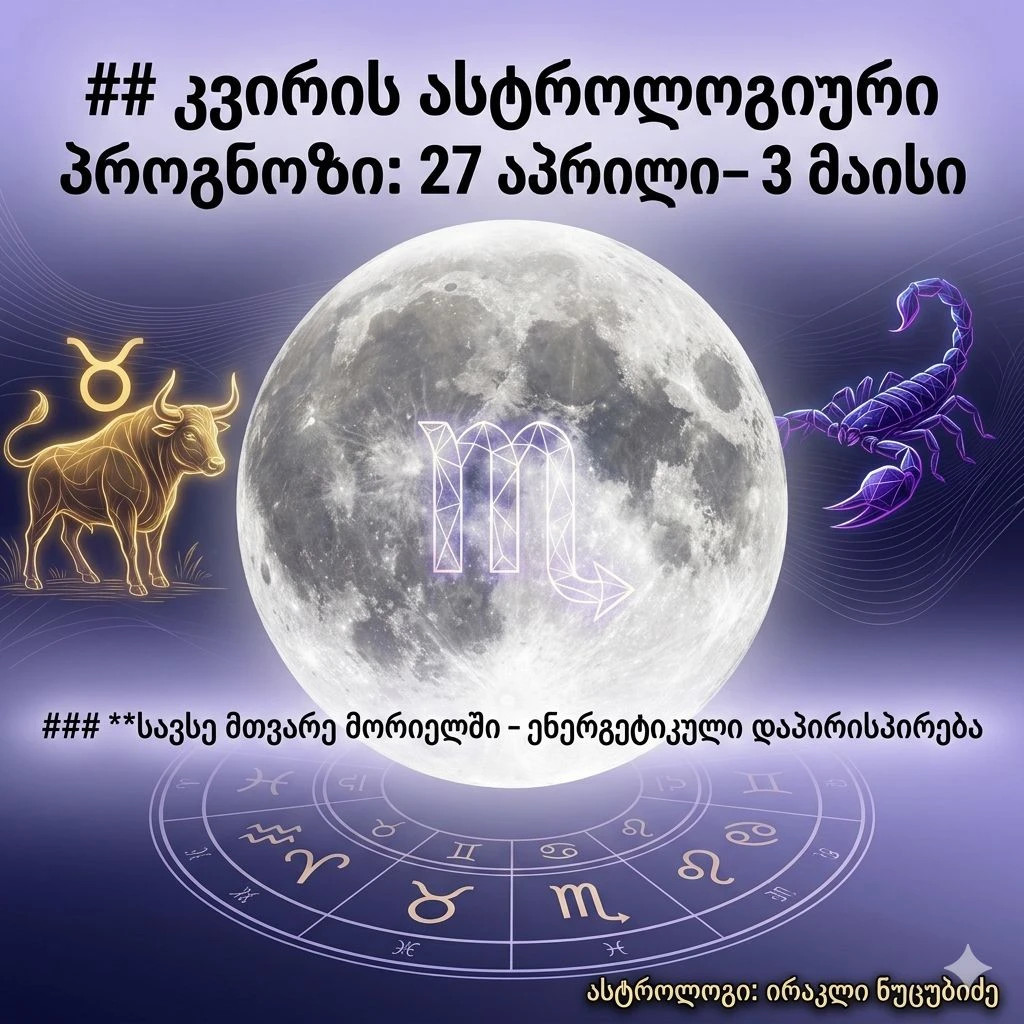 სავსე მთვარე თქვენს მე-4 სახლშია — აქცენტი გადადის ოჯახზე, ფესვებსა და საცხოვრებელზე. შესაძლოა ძველმა ოჯახურმა წყენებმა ან ფარულმა პრობლემებმა იფეთქოს. მზის პოზიცია კუროში (თქვენს მე-10 სახლში) მიგვანიშნებს, რომ კარიერასა და ოჯახს შორის ბალანსის პოვნა გაგიჭირდებათ. მოერიდეთ უძრავი ქონების ყიდვა-გაყიდვასთან დაკავშირებულ ხელშეკრულებებს 10 მაისამდე.
