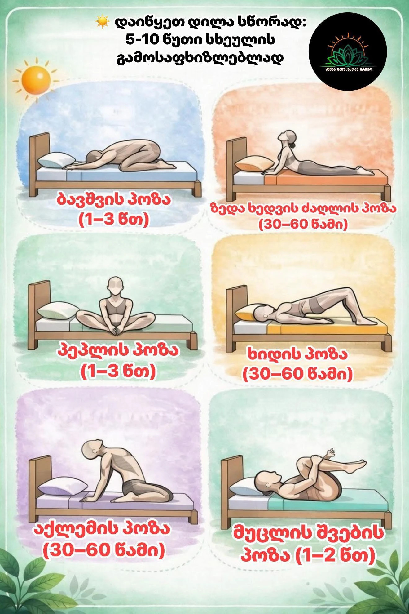 გთავაზობთ დილის ვარჯიშებს, რომელიც დაგეხმარებათ გამოფხიზლებაში, თუმცა გახსოვდეთ ინფორმაციას აქვს შემეცნებითი ხასიათი. თუ გაქვთ ტრავმა ან მუდმივი ტკივილი, აუცილებლად გაიარეთ კონსულტაცია ექიმთან ვარჯიშის დაწყებამდე.