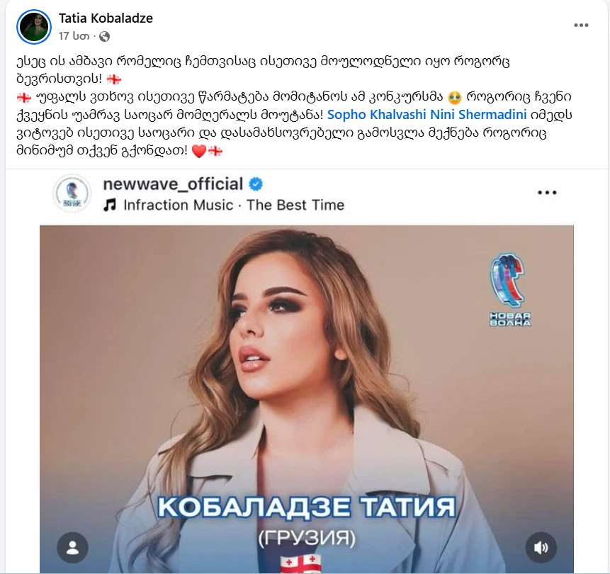 სოფო ხალვაშს, ნინი შერმადინს, იმედს ვიტოვებ, ისეთივე საოცარი და დასამახსოვრებელი გამოსვლა მექნება როგორიც მინიმუმ თქვენ გქონდათ!“,- წერს კობალაძე.