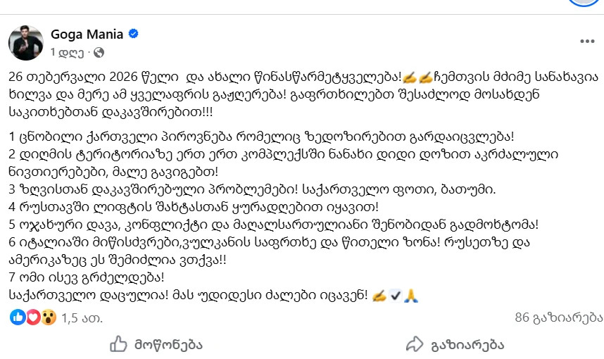 ომთან დაკავშირებით ქართველმა ეზოტერიკოსმა გოგა მანიამ რამდენიმე დღის წინ იწინასწარმეტყველა და დასძინა, მიუხედავად მსოფლიოში მოსალოდნელი ომის საფრთხისა საქართველო დაცულია.