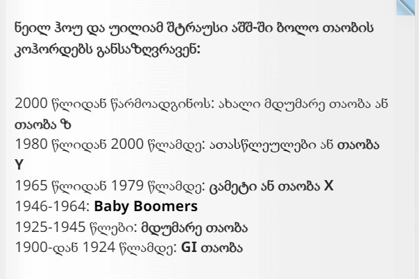 Generation X, Generation Y, Generation Z - ვინ არიან ეს ადამიანები? 1991 წელს ორმა ამერიკელმა მკვლევარმა აღწერა სხვადასხვა თაობის მახასიათებლები და განსხვავებები: უილიამ შტრაუსი და ნილ ჰოუ. მათ მიერ შექმნილი თეორია ეფუძნებოდა იმ ფაქტს, რომ სხვადასხვა თაობის ღირებულებითი ორიენტაციები მნიშვნელოვნად განსხვავდება.