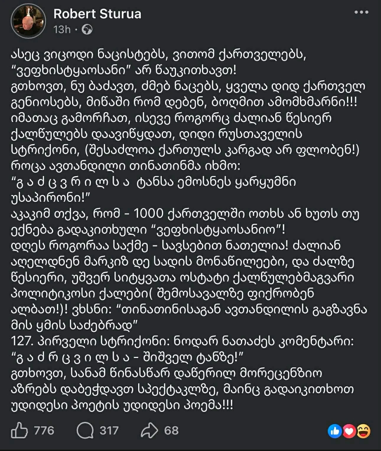 გთხოვთ, სანამ წინასწარ დაწერილ სარეცენზიო აზრებს დაბეჭდავთ სპექტაკლზე, მაინც გადაიკითხოთ უდიდესი პოეტის უდიდესი პოემა!!!“,- წერს რობერტ სტურუა.