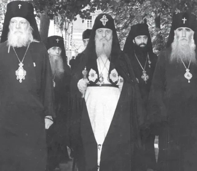ფოტოზე ეპისკოპოსი ზინობი (მაჟუგა), კათალიკოს-პატრიარქი ეფრემ მეორე, ბერმონაზონი ილია შიოლაშვილი: