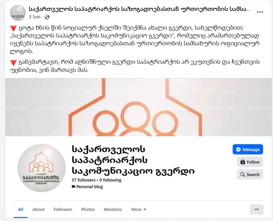 განვმარტავთ, რომ აღნიშნული გვერდი საპატრიარქოს არ ეკუთვნის და ჩვენთვის უცნობია, ვინ მართავს მას“,- აღნიშნულია მიმართვაში.