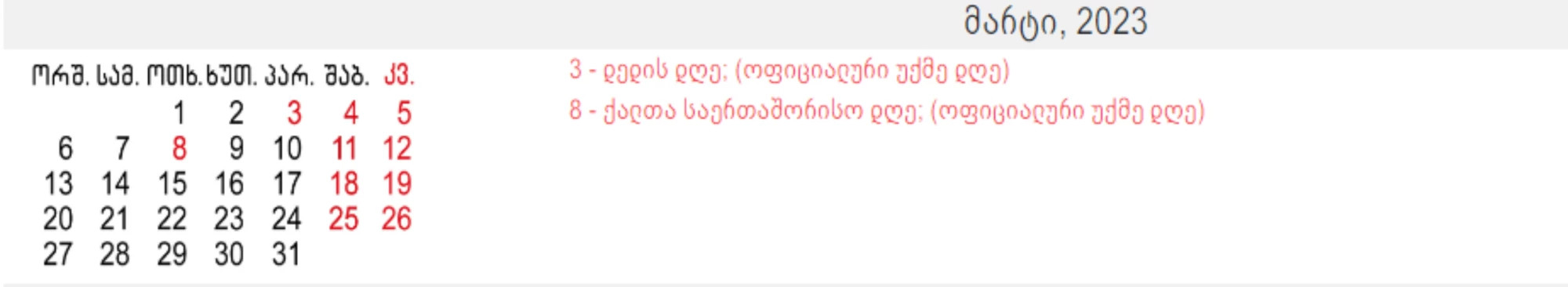 კალენდარზე წითლად აღნიშნულია ოფიციალური უქმე დღეები საქართველოს შრომის კოდექსის შესაბამისად.