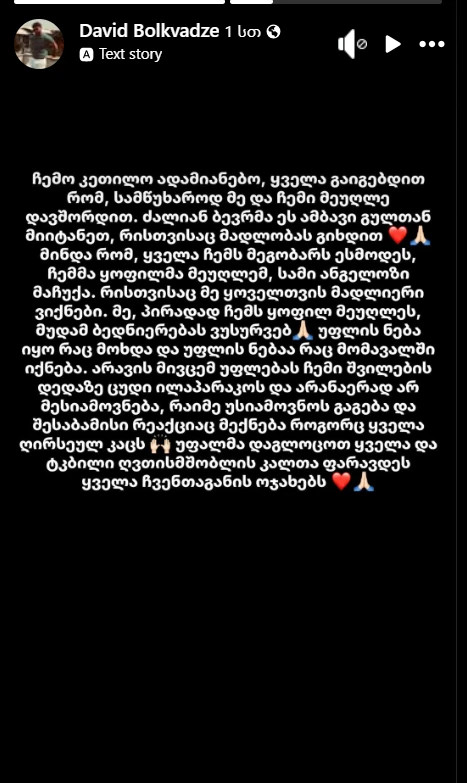 როგორც ბოლქვაძე წერს, იგი მადლობას უხდის გულშემატკივრებს მხარდაჭერისთვის და ხაზგასმით აღნიშნავს, რომ ყოფილი მეუღლის მიმართ მხოლოდ პატივისცემასა და მადლიერებას გრძნობს: