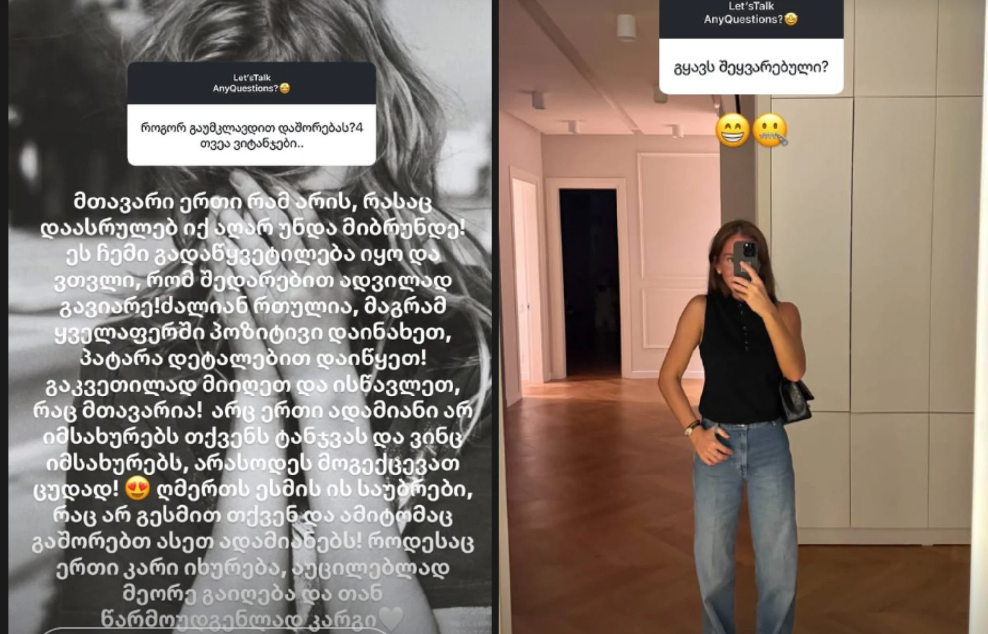 ეს ჩემი გადაწყვეტილება იყო და ვთვლი, რომ შედარებით ადვილად გავიარე! ძალიან რთულია, მაგრამ ყველაფერში პოზიტივი დაინახეთ, პატარა დეტალებით დაიწყეთ! გაკვეთილად მიიღეთ და ისწავლეთ რაც მთავარია! არც ერთი ადამიანი არ იმსახურებს თქვენს ტანჯვას და ვინც იმსახურებს, არასდროს მოგექცევათ ცუდად.