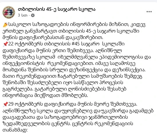 22 ოქტომბერს თბილისის #45 საჯარო სკოლაში დაფიქსირდა მუნის ერთი შემთხვევა. აღნიშნულ შემთხვევაზე სკოლამ იხელმძღვანელა ეპიდემიოლოგისა და ინფექციონისტის რეკომენდაციებით. იმავე საღამოსვე მოახდინა შენობის სრული დეზინფექცია და დეზინფექცია. მათი რეკომენდაციით ჩატარებული სამუშაოების შემდეგ შენობაში შესაძლებელი იყო სასწავლო პროცესის გაგრძელება. გატარებული ღონისძიებების შესახებ ინფორმაცია მიეწოდათ მშობლებს.