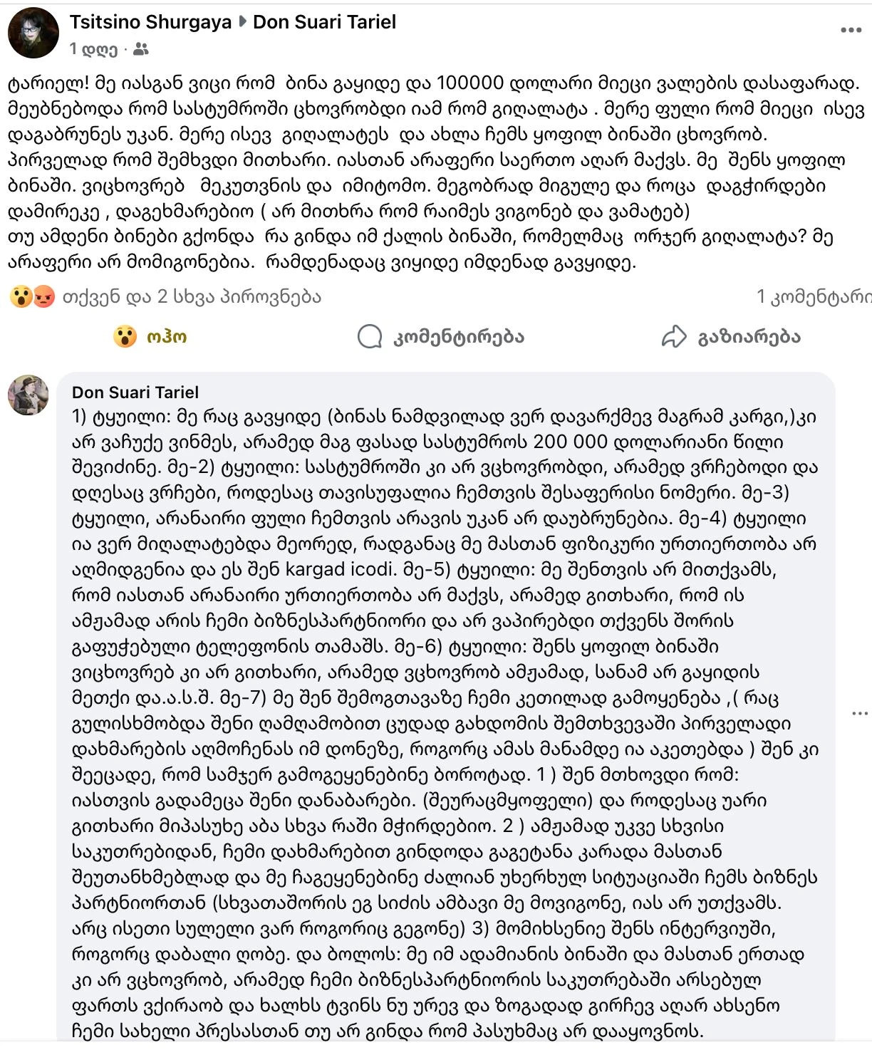 „1) ტყუილი: მე რაც გავყიდე (ბინას ნამდვილად ვერ დავარქმევ მაგრამ კარგ,) კი არ ვაჩუქე ვინმეს, არამედ მაგ ფასად სასტუმროს 200 000 დოლარი წილი შევიძინე.