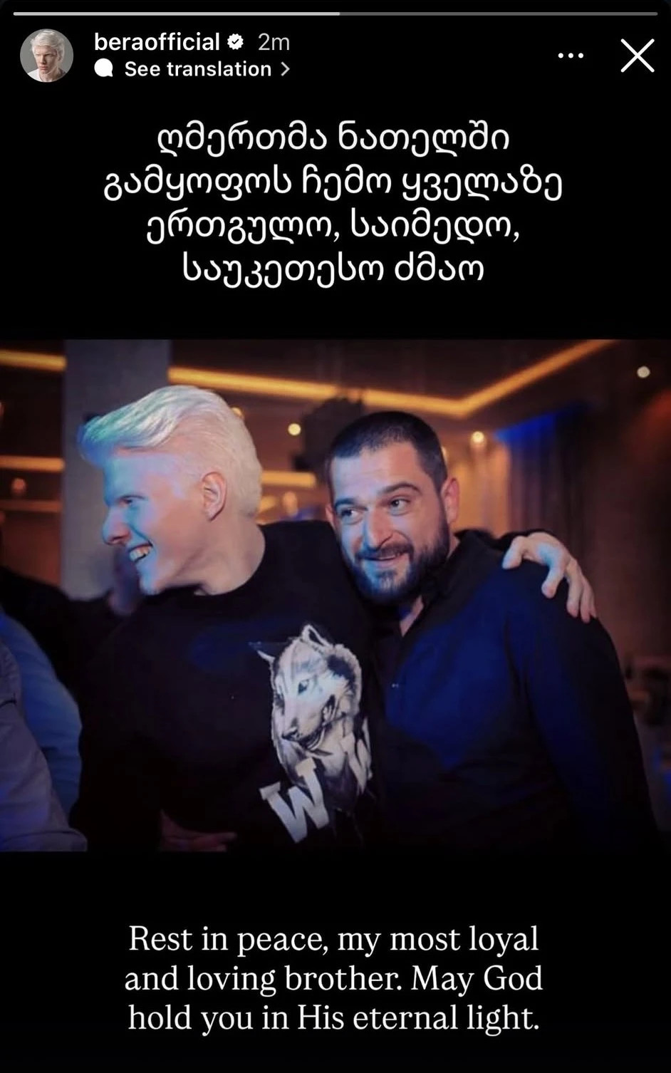 „ღმერთმა ნათელში გამყოფოს ჩემო ყველაზე ერთგულო, საიმედო, საუკეთესო ძმაო“, - წერს ბერა ივანიშვილი.