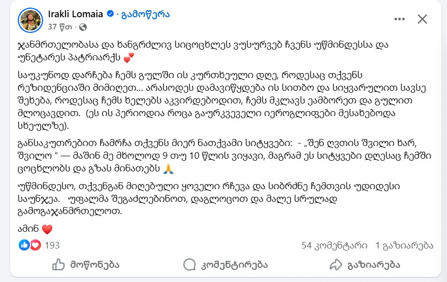 მსახიობი ირაკლი ლომაია სოციალურ ქსელში ემოციურ პოსტს აქვეყნებს პატრიარქ ილია მეორეზე: