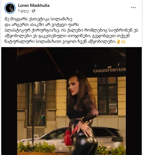 „მე მიყვარს ესთეტიკა, სილამაზე და არცერთ ასაკში არ ვიტყვი უარს პლასტიკურ ქირურგიაზე. ის ქალები, რომლებიც საუბრობენ „ეს აწყობილები“, „ეს გაკეთებული თოჯინები“ - გვჯობდეთ თქვენი ნატურალური სილამაზით, ვიყოთ ჩვენ აწყობილები“, - წერს ლორენ მასხულია.