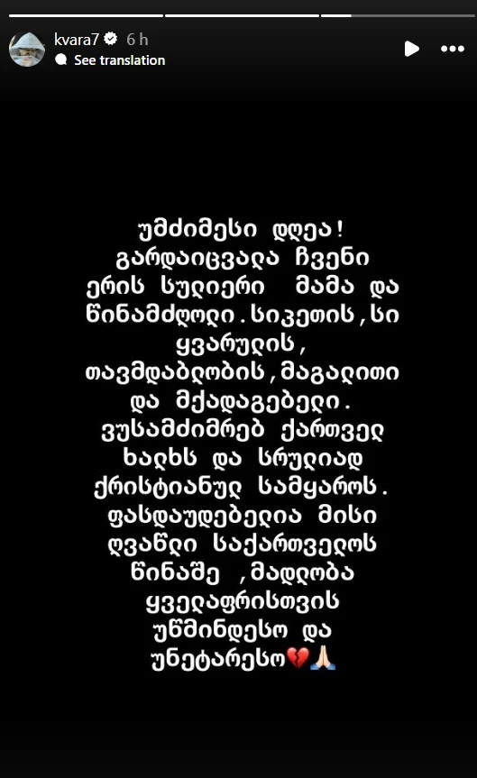 „უმძიმესი დღეა! გარდაიცვალა ჩვენი მამა და ერის სულიერი წინამძღოლი. სიკეთის, სიყვარულის, თავმდაბლობის, მაგალითი და მქადაგებელი.