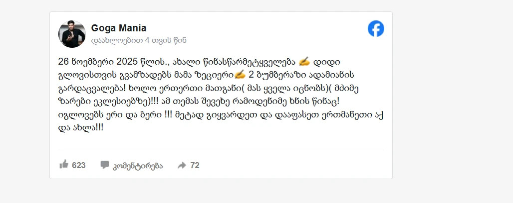 ცნობისთვის, გოგა მანიამ კათალიკოს-პატრიარქის გარდაცვალება რამდენიმე თვის წინ იწინასწარმეტყველა. იგი 2025 წლის 26 ნოემბერს გავრცელებულ წინასწარმეტყველებაში წერდა: