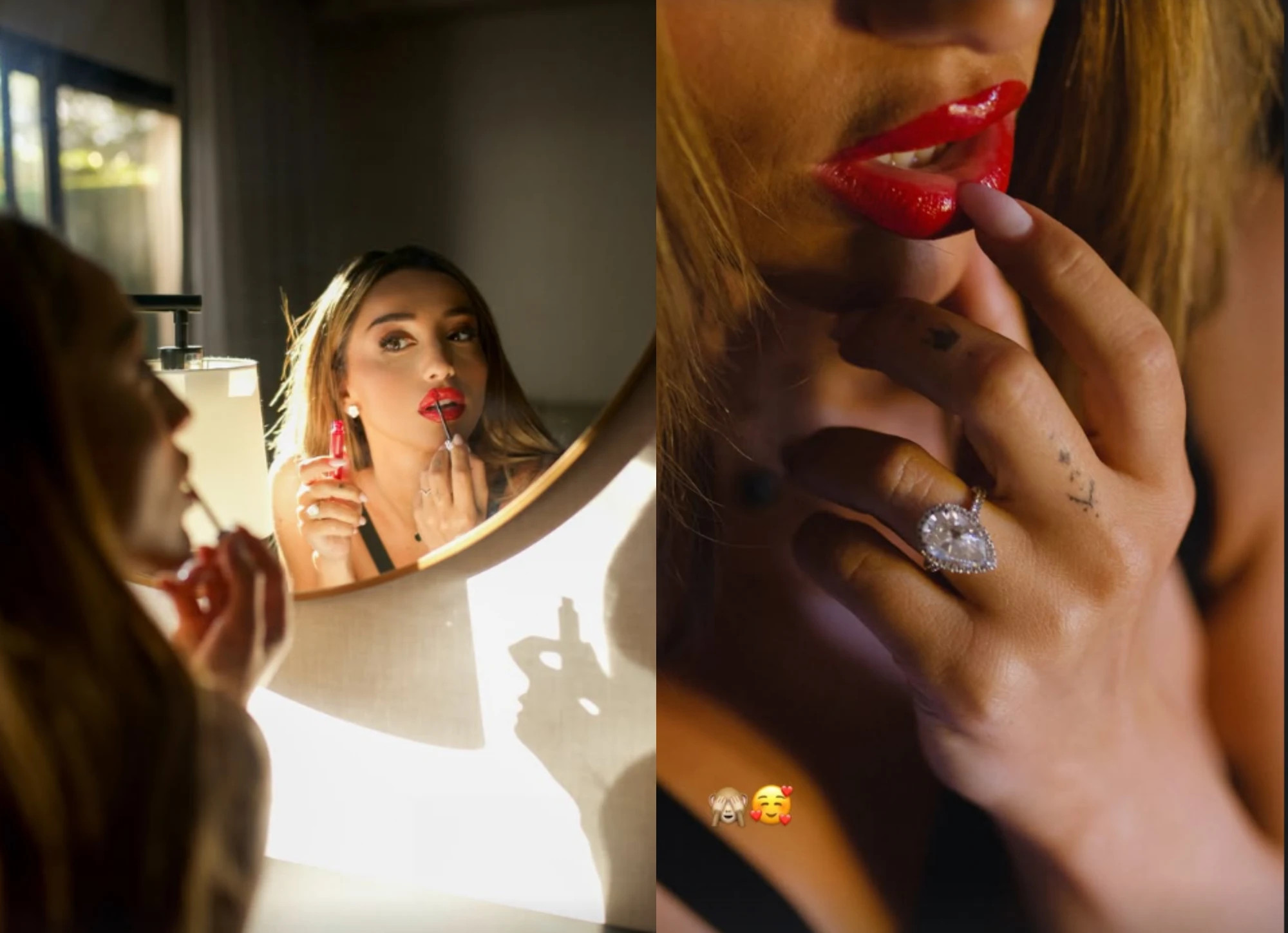 ფოტოში ასევე გამოაჩინა თავისი ნიშნობის ბეჭედიც.