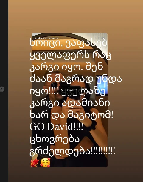 ამჯერად ალექსანდრამ სოციალურ ქსელში დავით კოდუასთან ერთად გადაღებული კადრები ამოაზიარა და მას მიმართა:
