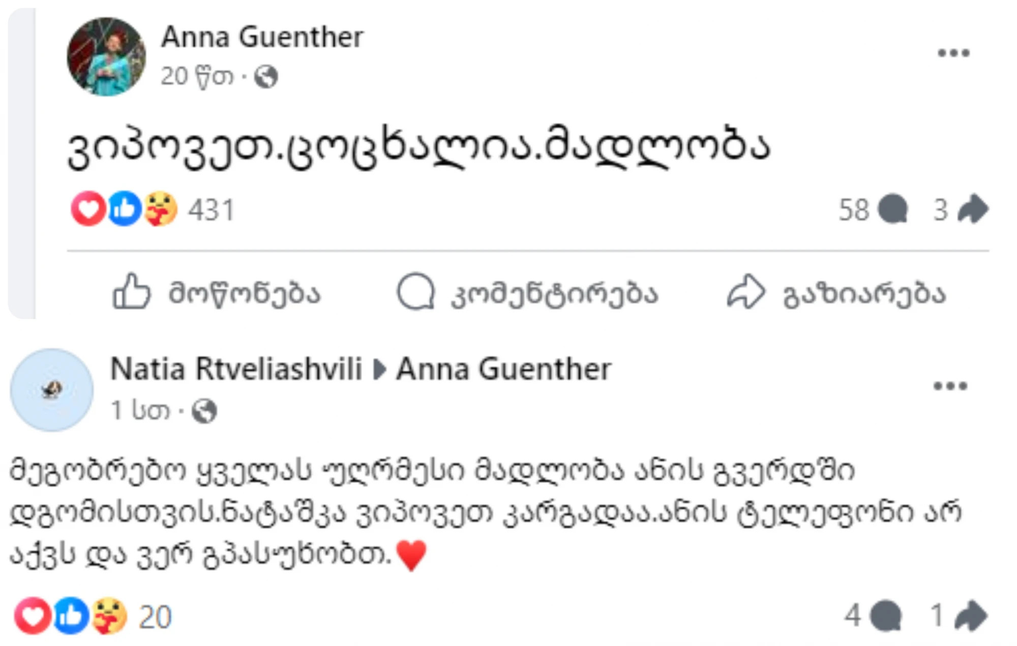 „მეგობრებო ყველას უღრმესი მადლობა ანის გვერდში დგომისთვის. ნატაშკა ვიპოვეთ კარგადაა. ანის ტელეფონი არ აქვს და ვერ გპასუხობთ“, - წერს ნათია რთველიაშვილი.