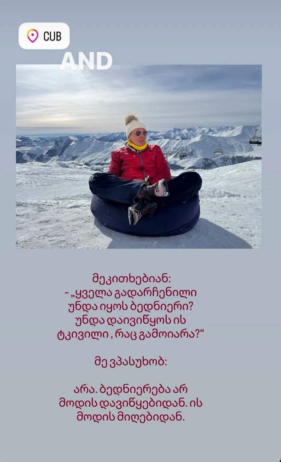 „სანამ მეტყოდნენ, ტვინში უკვე ვიცოდი, რომ კიბო მქონდა. მთელი ცხოვრების მანძილზე ველოდებოდი კიბოს და ვიცოდი, რომ აუცილებლად მომიწევდა მასთან გამკლავება. ერთი დეიდა ძუძუს კიბოთი გარდაცვლილი, მეორეს რემისია აქვს. თან, როგორც მოვიქცეოდი რეგულარულად, იცით? 6 თვეში ერთხელ ვიმოწმებდი თავს. 100 პროცენტით ვიცი, რომ მე დავმარცხე საკმარისი თავი. ახლა, ამ გამოცდილებისგან, სხვანაირად ვუყურებ ჩემს ფიქრებს.