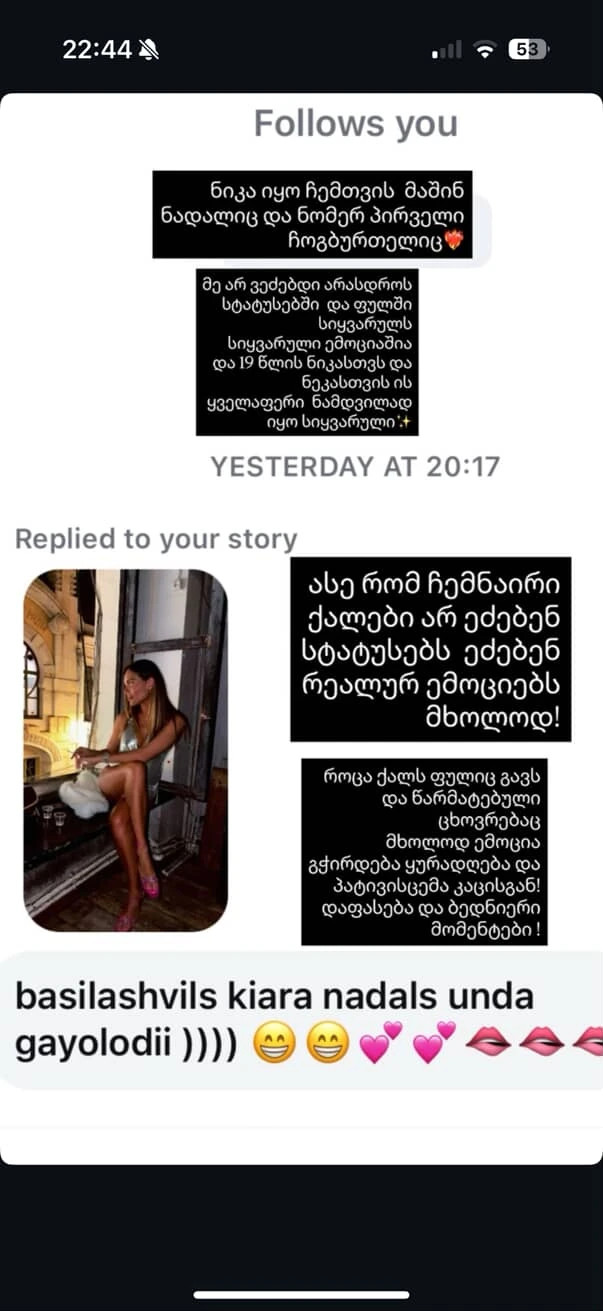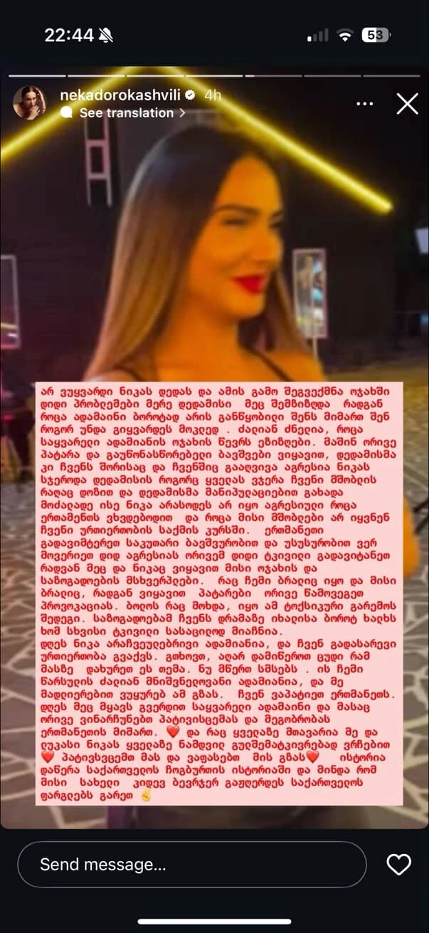 დღეს ნიკა არაჩვეულებრივი ადამიანია და ჩვენ გადასარევი ურთიერთობა გვაქვს. გთხოვთ, არ დამიწეროთ ცუდი რამ მასზე, დახურეთ ეს თემა. ნუ მწერთ სმს-ებს. ის ჩემი წარსულის ძალიან მნიშვნელოვანი ადამიანია და მე მადლიერებით ვუყურებ ამ გზას. ჩვენ ვაპატიეთ ერთმანეთს.