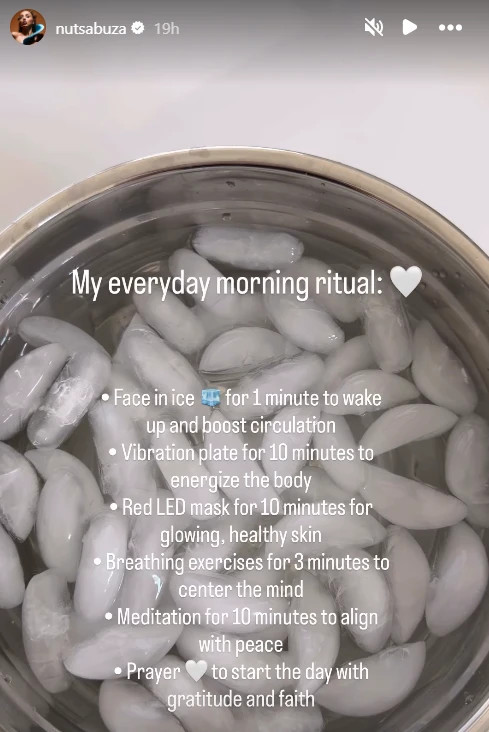 როგორც ნუცა წერს, ყოველ დილით სახეს ყინულიან თასში დებს რამდენიმე წუთი და ეს მას, გამოფხიზლებაში ეხმარება.