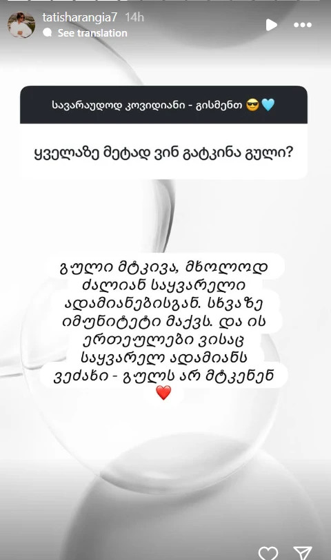 - გული მტკივა, მხოლოდ ძალიან საყვარელი ადამიანებისგან. სხვაზე იმუნიტეტი მაქვს. და ის ერთეულები, ვისაც საყვარელ ადამიანს ვეძახი - გულს არ მტკენენ.