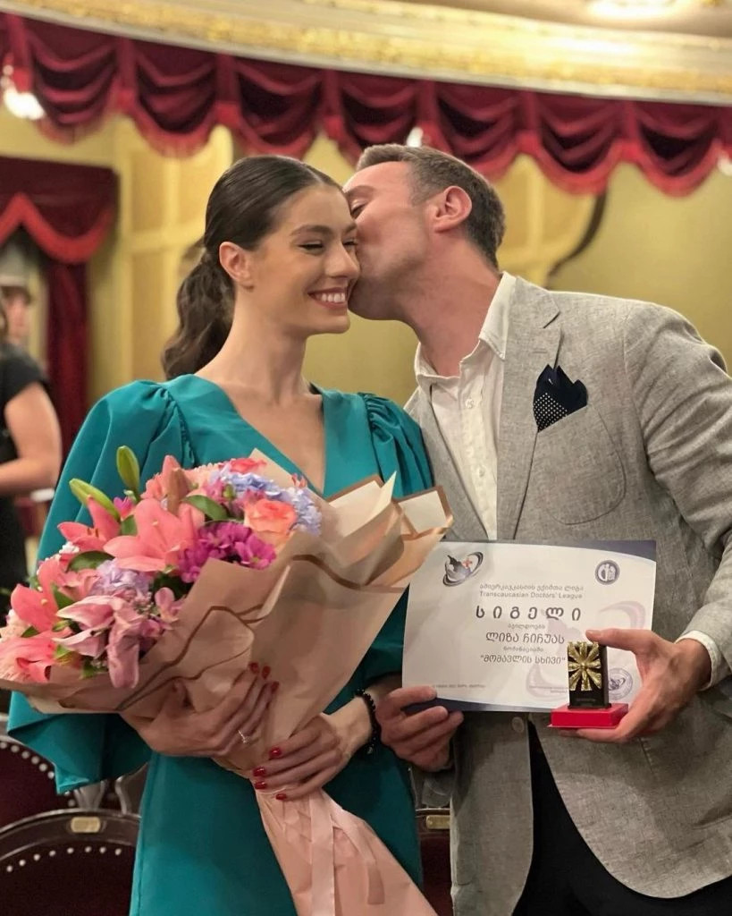 ტელეწამყვანი ირაკლი მაქაცარია თავის საცოლეს ლიზა ჩიჩუას დაჯილდოებას ულოცავს.