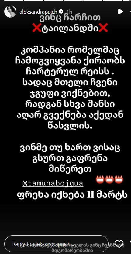 ახლო აღმოსავლეთში შექმნილი ვითარების გამო ტაილანდში ფრენები გადაიდო. იქ იმყოფება ქართველი ტურისტებიც ერთ-ერთი მათგანი მოდელი და ტელეწამყვანი ალექსანდრა პაიჭაძეა, რომელიც სოციალურ ქსელში მიმართვას ავრცელებს.