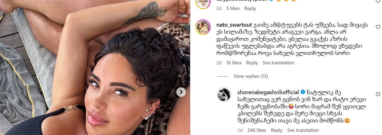 „ნატულიკ, მე სახელითაც ვერ გცნობ, ვინ ხარ და რატომ ერევი ჩემს გარეგნობაში. სორი, მაგრამ შენ ყვითელ კბილებს შეხედე და მერე მიეცი სხვას შენიშვნა. ჩემი თავი მე ასეთი მომწონს“, - უპასუხა ბეგაშვილმა.